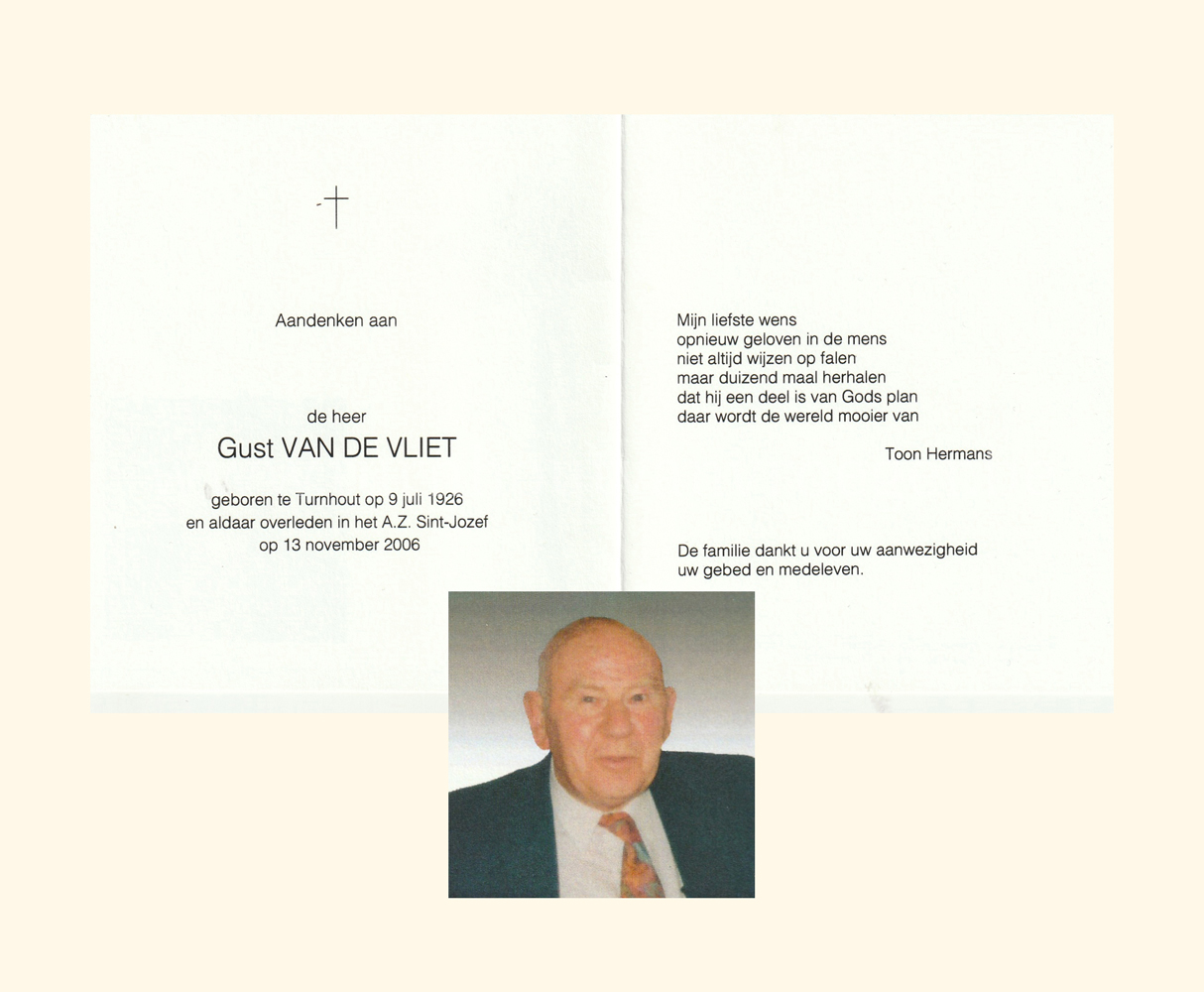 Wij willen met deze website niemand kwetsen of beledigen, het is enkel de bedoeling om genealogische informatie weer te geven.  Daarenboven hechten we veel belang aan ieders privacy.  Heeft u bezwaar tegen de vermelding van een bidprentje van één van uw familieleden die de afgelopen 50 jaar overleden zijn, stuur dan een mailtje naar info@smartsitesolutions.be.