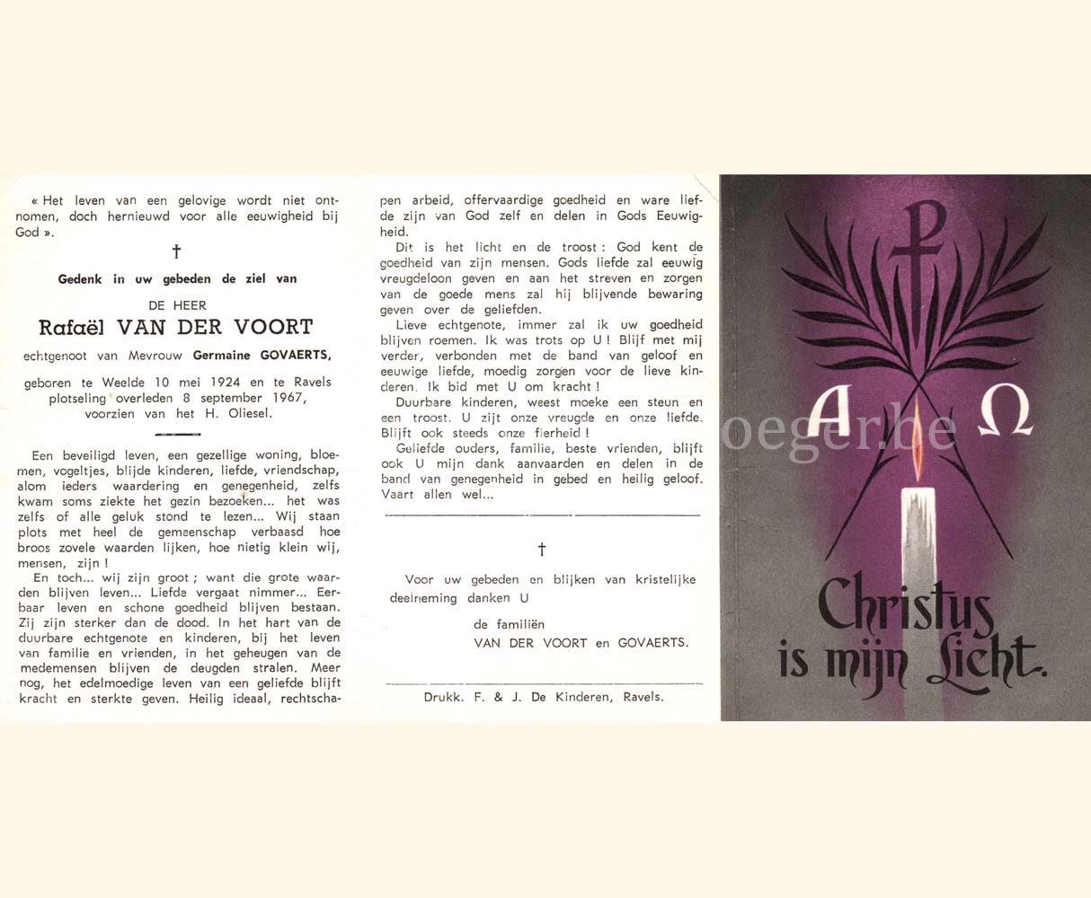 Wij willen met deze website niemand kwetsen of beledigen, het is enkel de bedoeling om genealogische informatie weer te geven.  Daarenboven hechten we veel belang aan ieders privacy.  Heeft u bezwaar tegen de vermelding van een bidprentje van één van uw familieleden die de afgelopen 50 jaar overleden zijn, stuur dan een mailtje naar info@smartsitesolutions.be.
