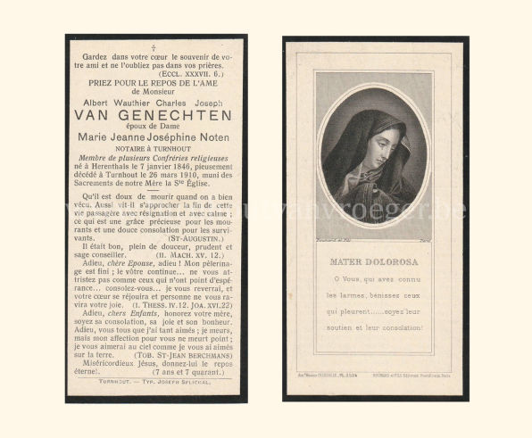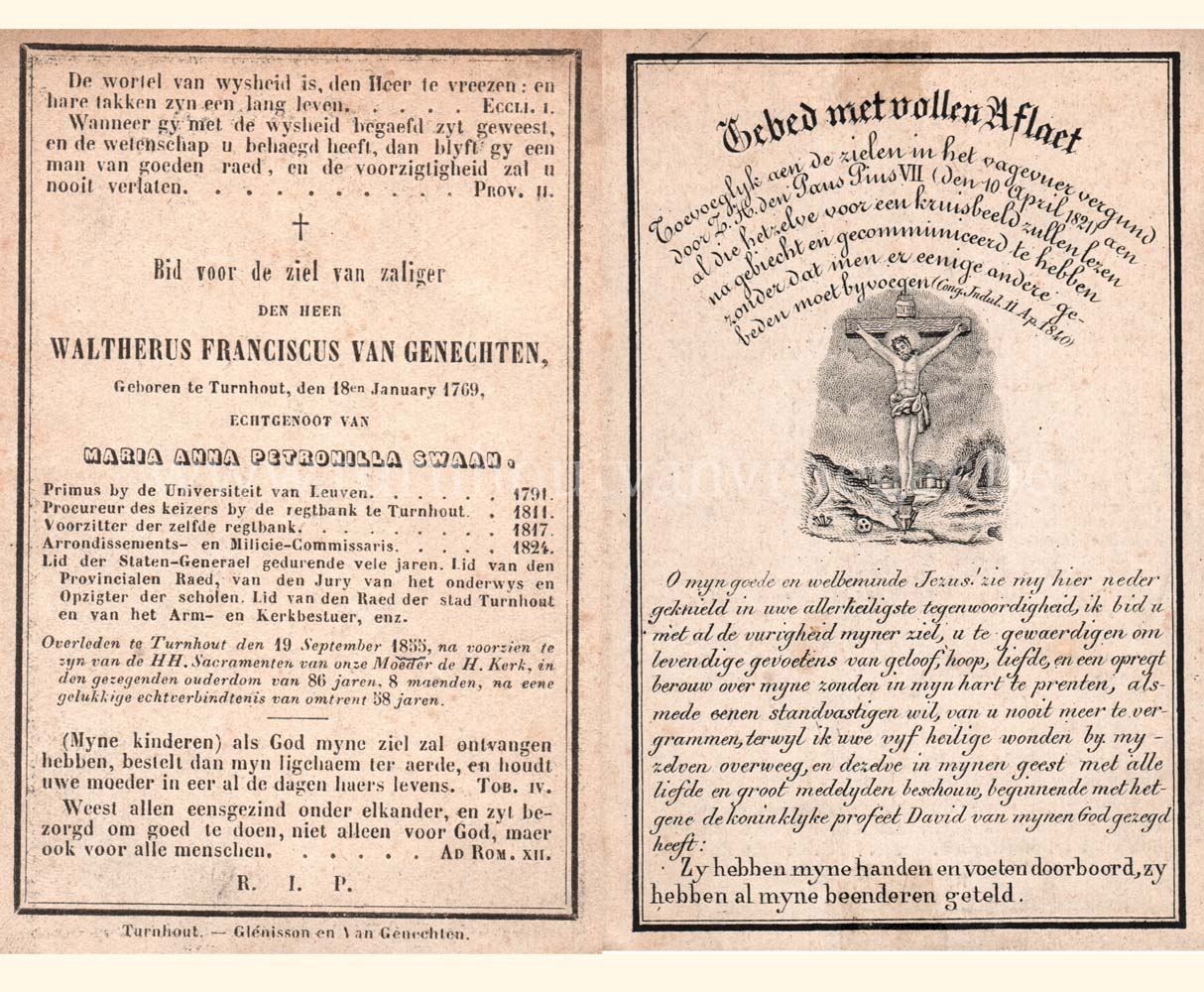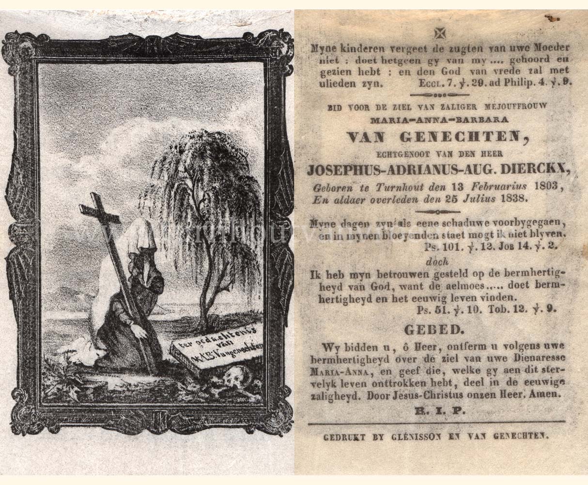 Een bidprentje uit 1855 dit keer, gedrukt bij Glénisson en Van Genechten van de stamvader van de familie Van Genechten: