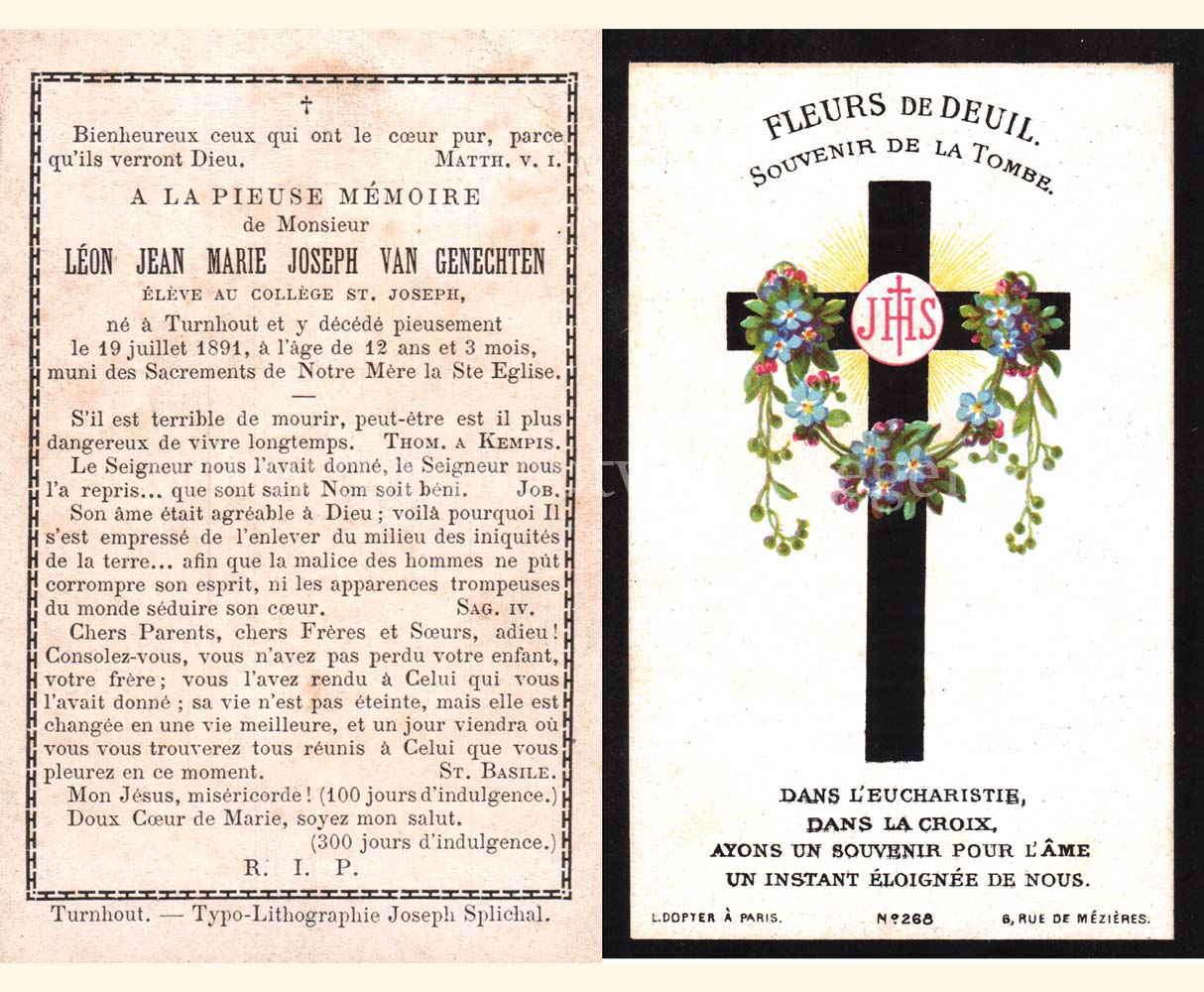 Een bidprentje van een Leuvense drukker (Alphonse Meulemans-De Preter) van een telg van een Turnhoutse familie waar ze onder andere ook bidprentjes drukten.