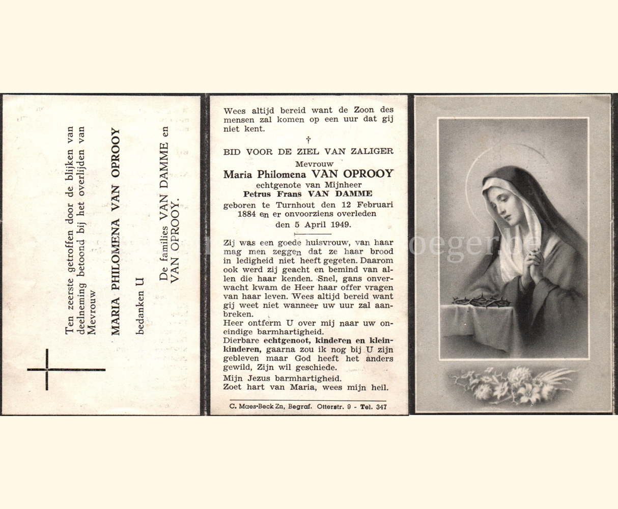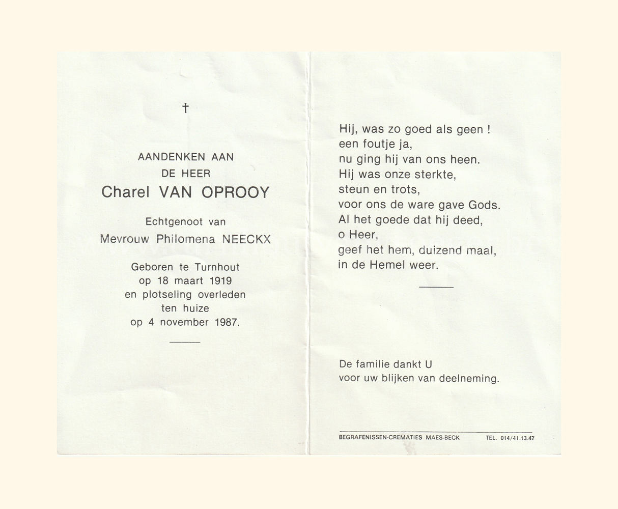 Wij willen met deze website niemand kwetsen of beledigen, het is enkel de bedoeling om genealogische informatie weer te geven.  Daarenboven hechten we veel belang aan ieders privacy.  Heeft u bezwaar tegen de vermelding van een bidprentje van één van uw familieleden die de afgelopen 50 jaar overleden zijn, stuur dan een mailtje naar info@smartsitesolutions.be.