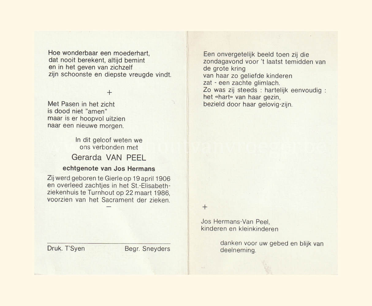Wij willen met deze website niemand kwetsen of beledigen, het is enkel de bedoeling om genealogische informatie weer te geven.  Daarenboven hechten we veel belang aan ieders privacy.  Heeft u bezwaar tegen de vermelding van een bidprentje van één van uw familieleden die de afgelopen 50 jaar overleden zijn, stuur dan een mailtje naar info@smartsitesolutions.be.