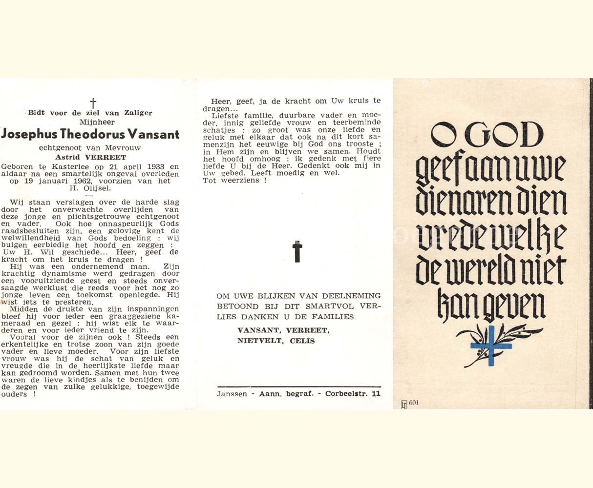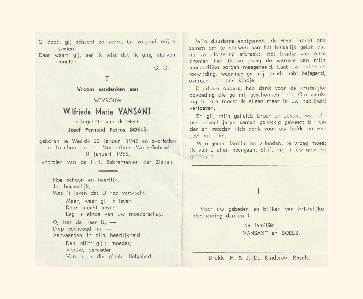 Wij willen met deze website niemand kwetsen of beledigen, het is enkel de bedoeling om genealogische informatie weer te geven.  Daarenboven hechten we veel belang aan ieders privacy.  Heeft u bezwaar tegen de vermelding van een bidprentje van één van uw familieleden die de afgelopen 50 jaar overleden zijn, stuur dan een mailtje naar info@smartsitesolutions.be.