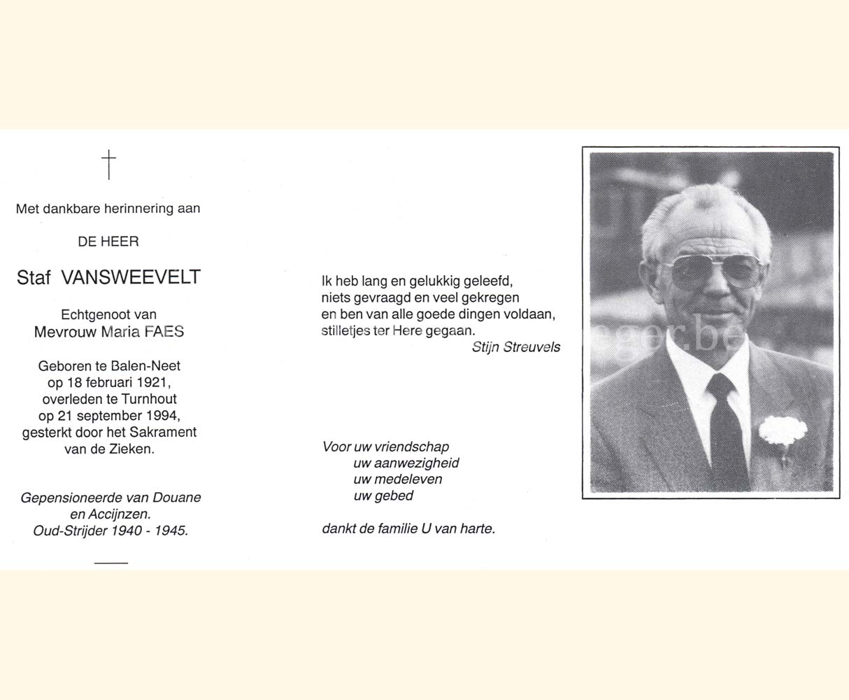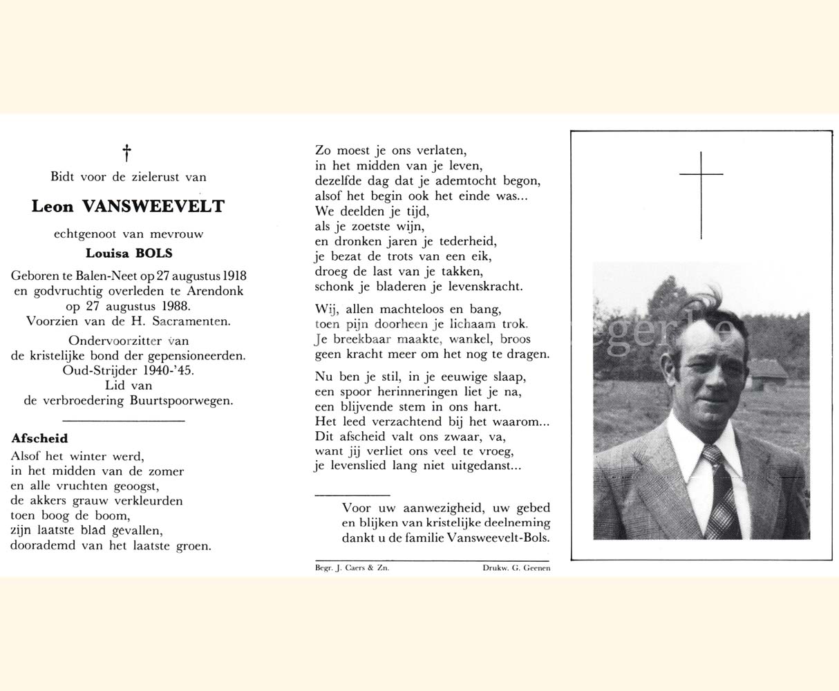 Wij willen met deze website niemand kwetsen of beledigen, het is enkel de bedoeling om genealogische informatie weer te geven.  Daarenboven hechten we veel belang aan ieders privacy.  Heeft u bezwaar tegen de vermelding van een bidprentje van één van uw familieleden die de afgelopen 50 jaar overleden zijn, stuur dan een mailtje naar info@smartsitesolutions.be.