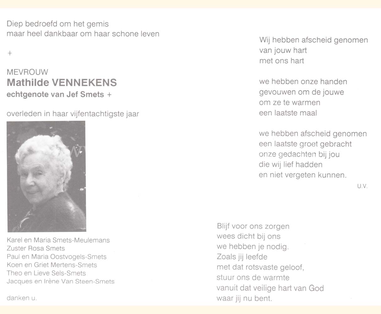 Wij willen met deze website niemand kwetsen of beledigen, het is enkel de bedoeling om genealogische informatie weer te geven.  Daarenboven hechten we veel belang aan ieders privacy.  Heeft u bezwaar tegen de vermelding van een bidprentje van één van uw familieleden die de afgelopen 50 jaar overleden zijn, stuur dan een mailtje naar info@smartsitesolutions.be.