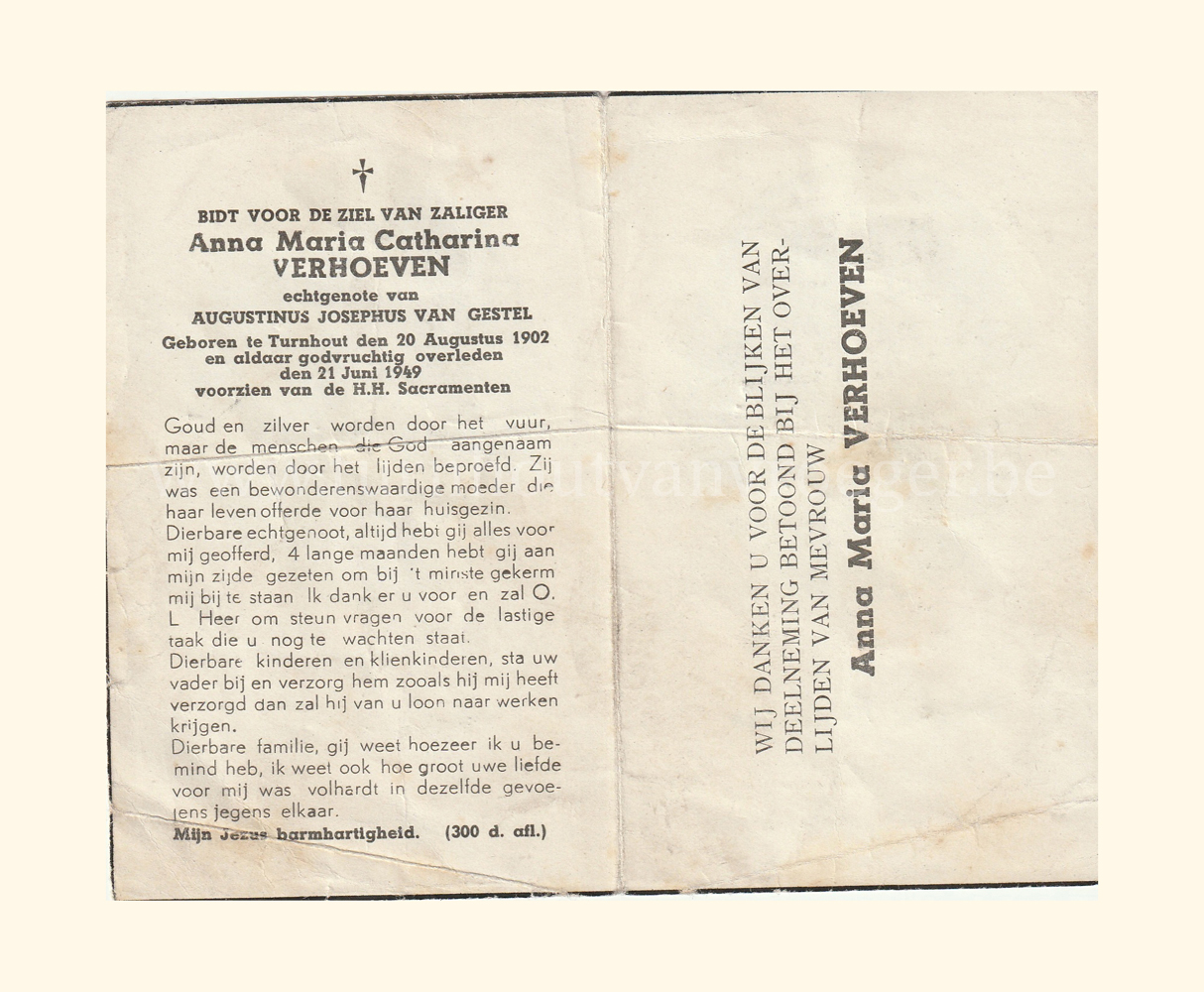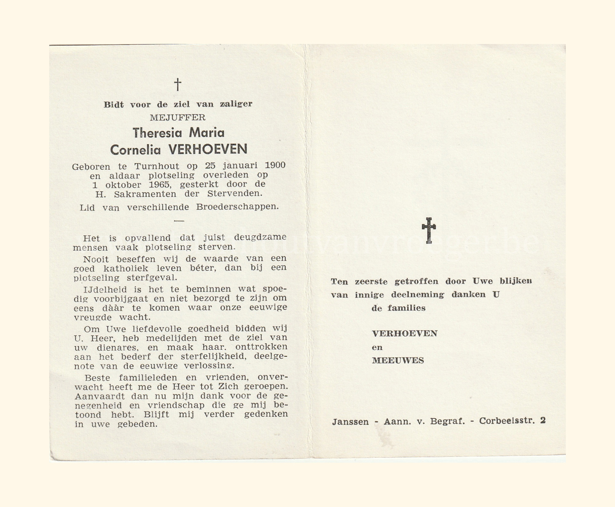 Wij willen met deze website niemand kwetsen of beledigen, het is enkel de bedoeling om genealogische informatie weer te geven.  Daarenboven hechten we veel belang aan ieders privacy.  Heeft u bezwaar tegen de vermelding van een bidprentje van één van uw familieleden die de afgelopen 50 jaar overleden zijn, stuur dan een mailtje naar info@smartsitesolutions.be.
