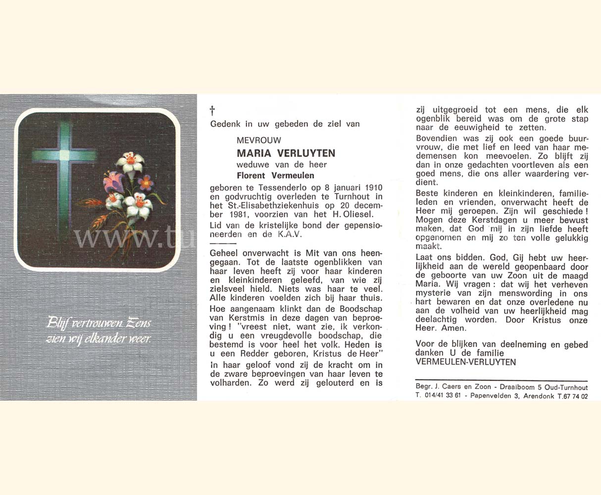 Wij willen met deze website niemand kwetsen of beledigen, het is enkel de bedoeling om genealogische informatie weer te geven.  Daarenboven hechten we veel belang aan ieders privacy.  Heeft u bezwaar tegen de vermelding van een bidprentje van één van uw familieleden die de afgelopen 50 jaar overleden zijn, stuur dan een mailtje naar info@smartsitesolutions.be.