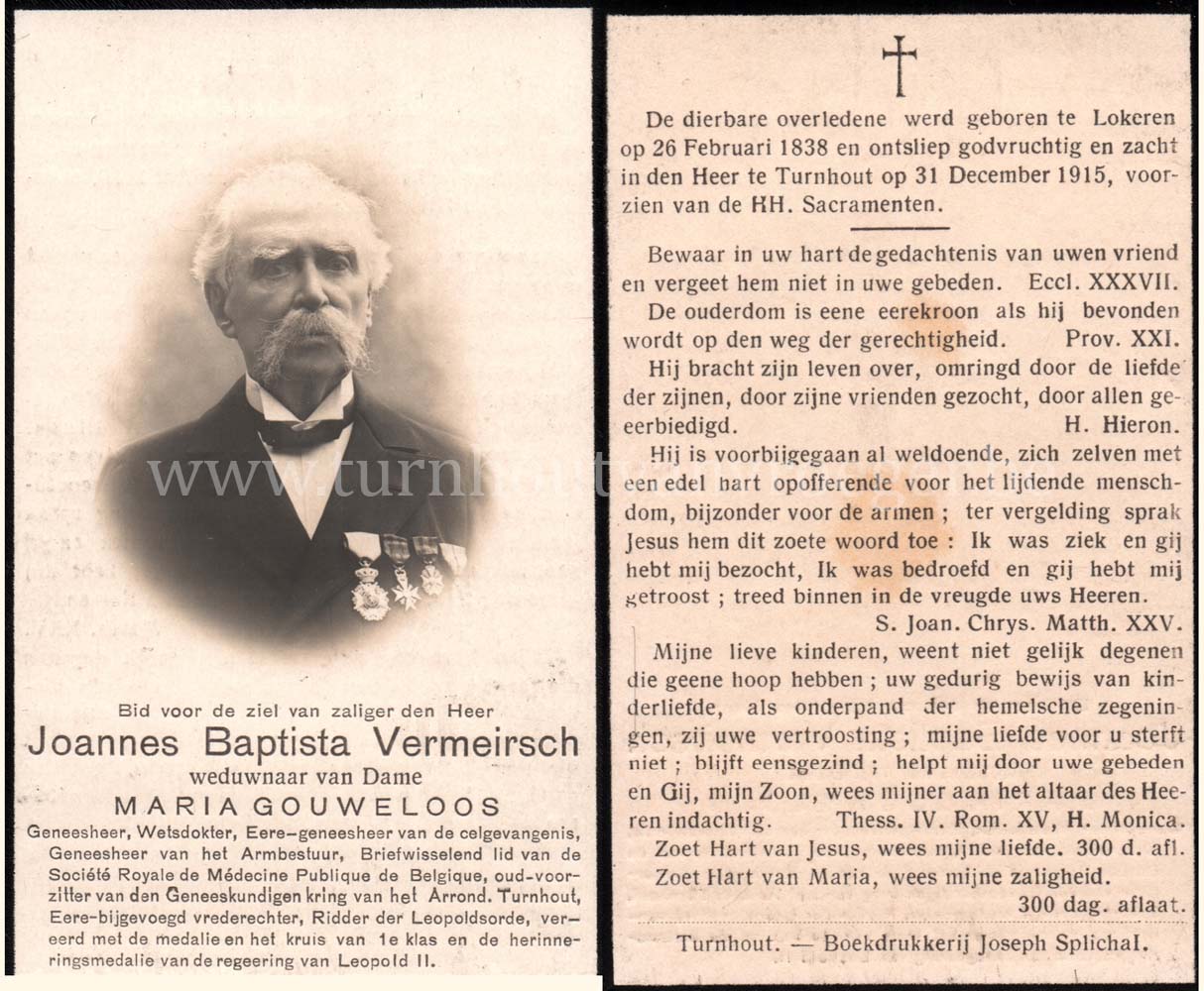 Op zijn bidprentje waarop ook zijn foto te zien is ontdekken we dat J.B. Vermeirsch geneesheer, wetsdokter, ere geneesheer van de gevangenis, geneesheer van het armenbestuur, ere bijgevoegd vrederechter, oud voorzitter van de geneeskundige kring van het arrondissement Turnhout en briefwisselend lid van de Société Royale de Médécine Publique de Belgique was. Tevens was hij Ridder in de Leopoldsorde, vereerd met de medaille en het kruis van 1ste klas en de herinneringsmedaille van de regering van Koning Leopold II.