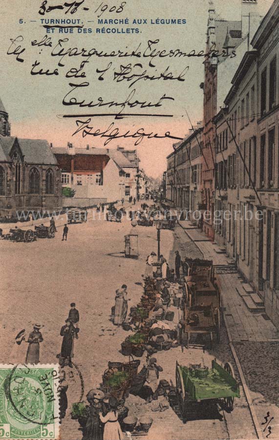 De tekst op de achterkant van deze postkaart verwijst naar de Arrondissementstentoonstelling die in 1909 in Turnhout gehouden werd. De afzender is "half klaar" met de voorbereidingen van "d'expositie". Ze hebben nog lijnwaad uit Antwerpen nodig (à 1 fr. de m.) en vragen aan de bestemmeling om deze te bezorgen en om zeker met juffrouw Celine en juffrouw Maria naar "d'expositie" te komen zien omdat de minister er ook zal zijn. Er wordt ook nog aangeraden om het lijnwaad in de "Blauwe Hand" (verwijzing naar "Den Azijn" - fabriek in Antwerpen) te fixeren.